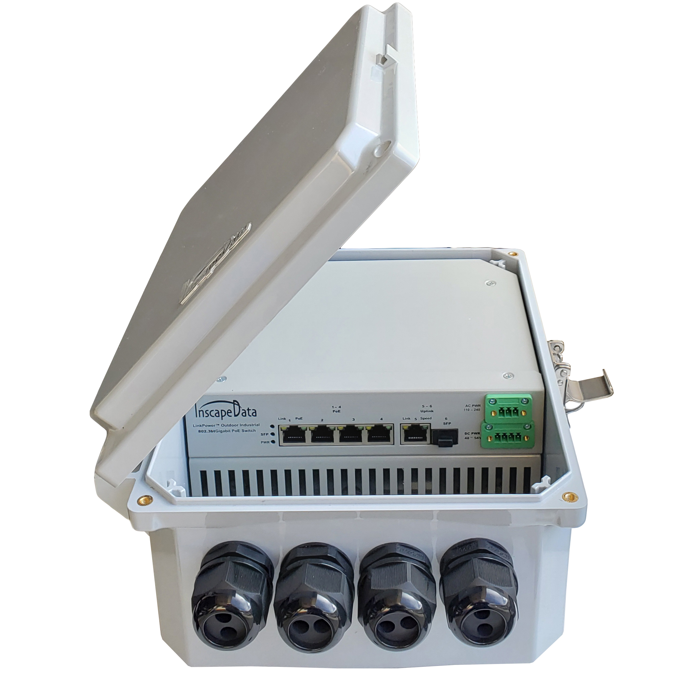 The LinkPower™ LPS940-T1 Series is an All-Weather 6-Port Gigabit Unmanaged IEEE802.3bt PoE (Power over Ethernet) Network Switch with 2 Uplink Ports (RJ45 or SFP depending on the model), with dual power input redundancy, i.e., 120V~240AC and/or 48V DC, delivers data and power over one single network cable protected with an IP66/68 compliant weatherproof enclosure. The outdoor weatherproof rating of the systems is strictly based on how the top cover is closed. For the hinged cover without the four top cover screws, the outdoor weatherproof rating is IP66 and, otherwise, the outdoor rating is IP68 with the four top cover screws securely closed with the enclosure. The hinged enclosure offers great convenience for outdoor network applications required frequent changes of network configuration.