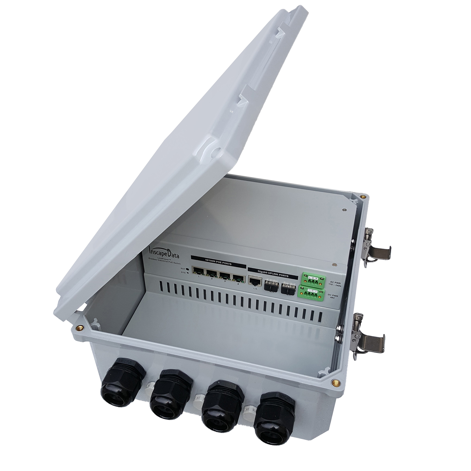 The LinkPower™ LPS3400ATMP-T1 Series is an All Weather Multi-Port, i.e., 6, 10, and 14 ports, L2+ Managed Gigabit PoE (Power over Ethernet) Switch, All-in-One-Box, solutions with dual power output redundancy, i.e., 120V~240AC and/or 48V DC, is the industry first outdoor weatherproof ready high speed gigabit Ethernet switch that delivers data and power over one single network cable protected with an IP66/68 compliant weatherproof enclosure. The outdoor weatherproof rating of the systems is strictly based on how the top cover is closed. For the hinged cover without the four top cover screws, the outdoor weatherproof rating is IP66 and, otherwise, the outdoor rating is IP68 with the four top cover screws securely closed with the enclosure. The hinged enclosure offers great convenience for outdoor network applications required frequent changes of network configuration.