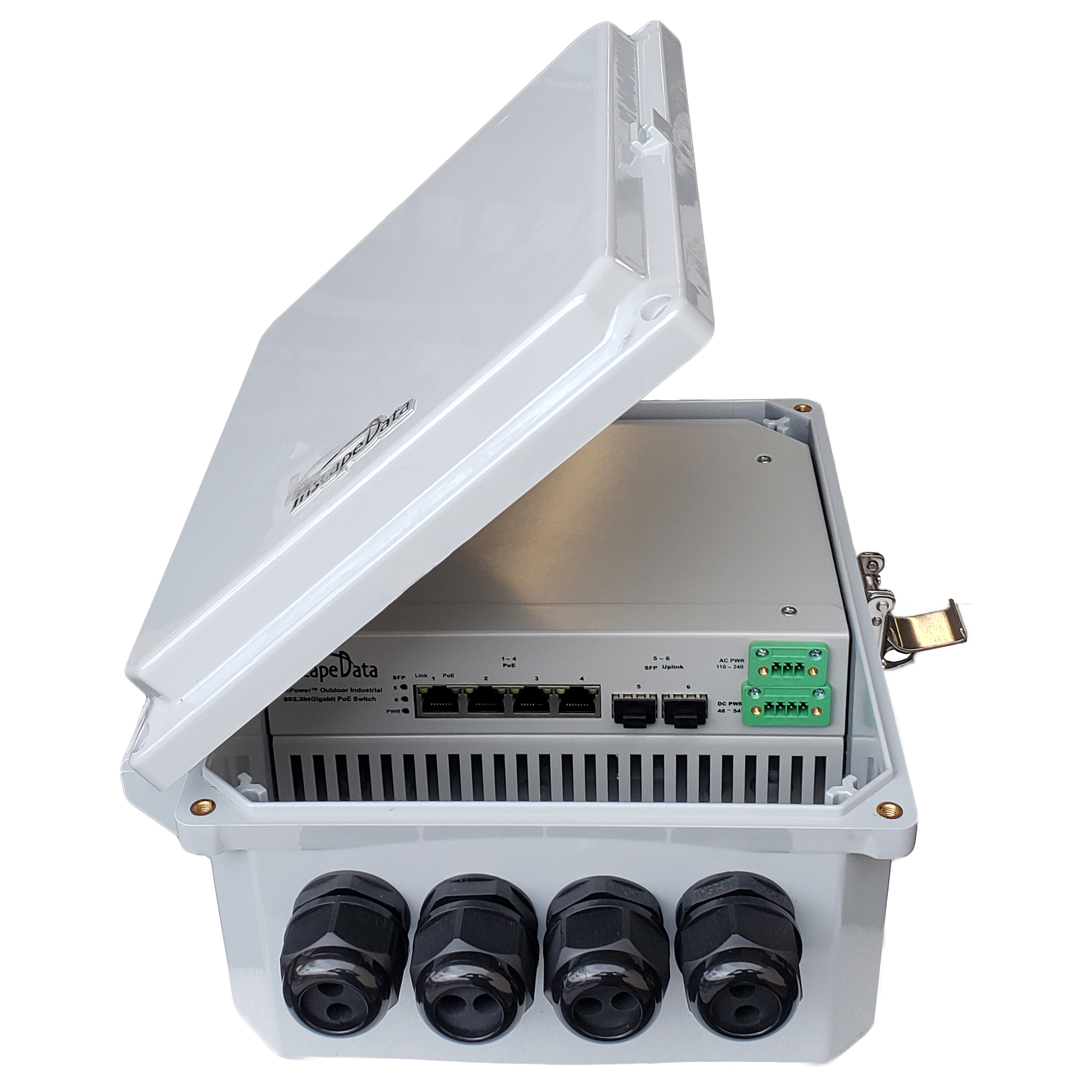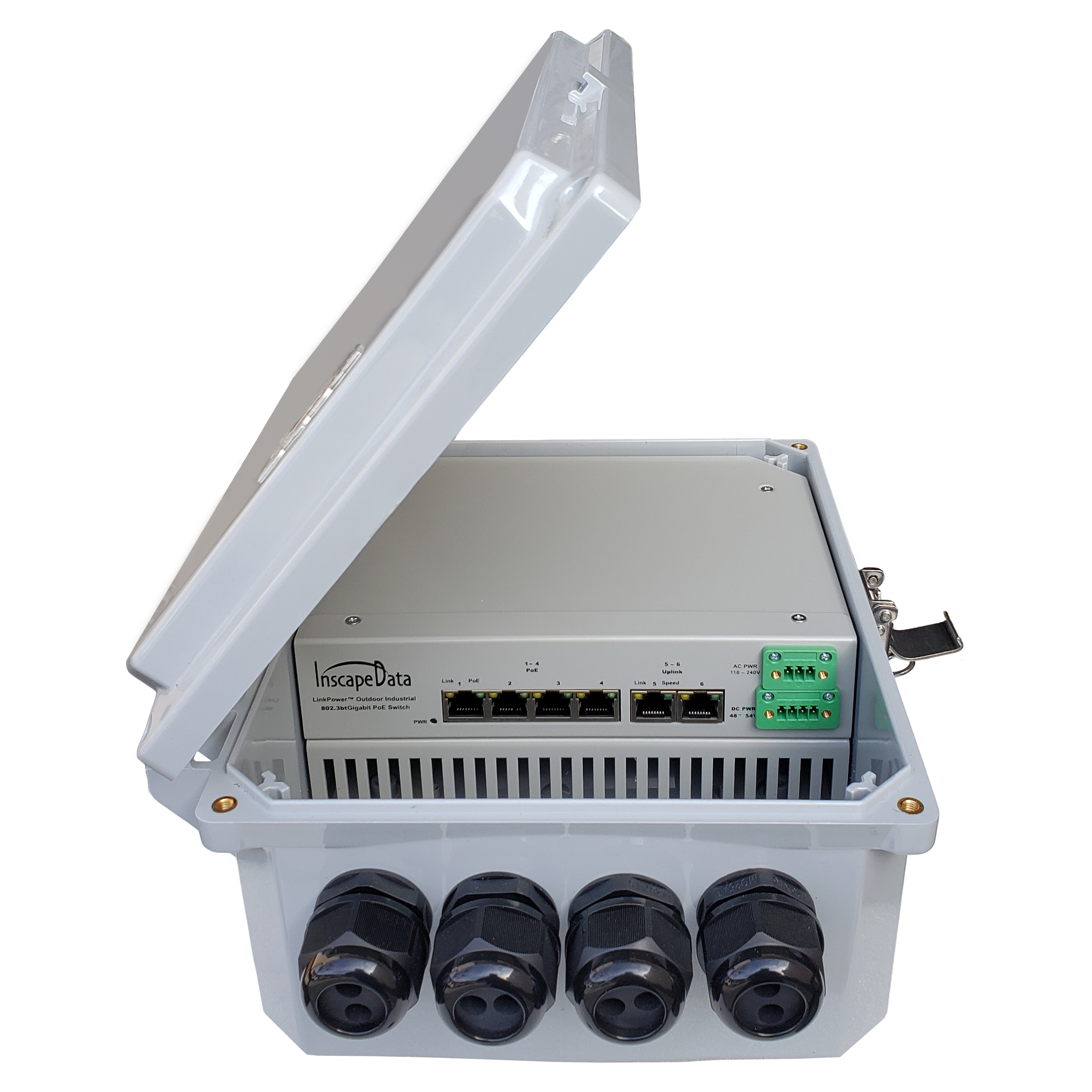The LinkPower™ LPS940-T1 Series is an All-Weather 6-Port Gigabit Unmanaged IEEE802.3bt PoE (Power over Ethernet) Network Switch with 2 Uplink Ports (RJ45 or SFP depending on the model), with dual power input redundancy, i.e., 120V~240AC and/or 48V DC, delivers data and power over one single network cable protected with an IP66/68 compliant weatherproof enclosure. The outdoor weatherproof rating of the systems is strictly based on how the top cover is closed. For the hinged cover without the four top cover screws, the outdoor weatherproof rating is IP66 and, otherwise, the outdoor rating is IP68 with the four top cover screws securely closed with the enclosure. The hinged enclosure offers great convenience for outdoor network applications required frequent changes of network configuration.